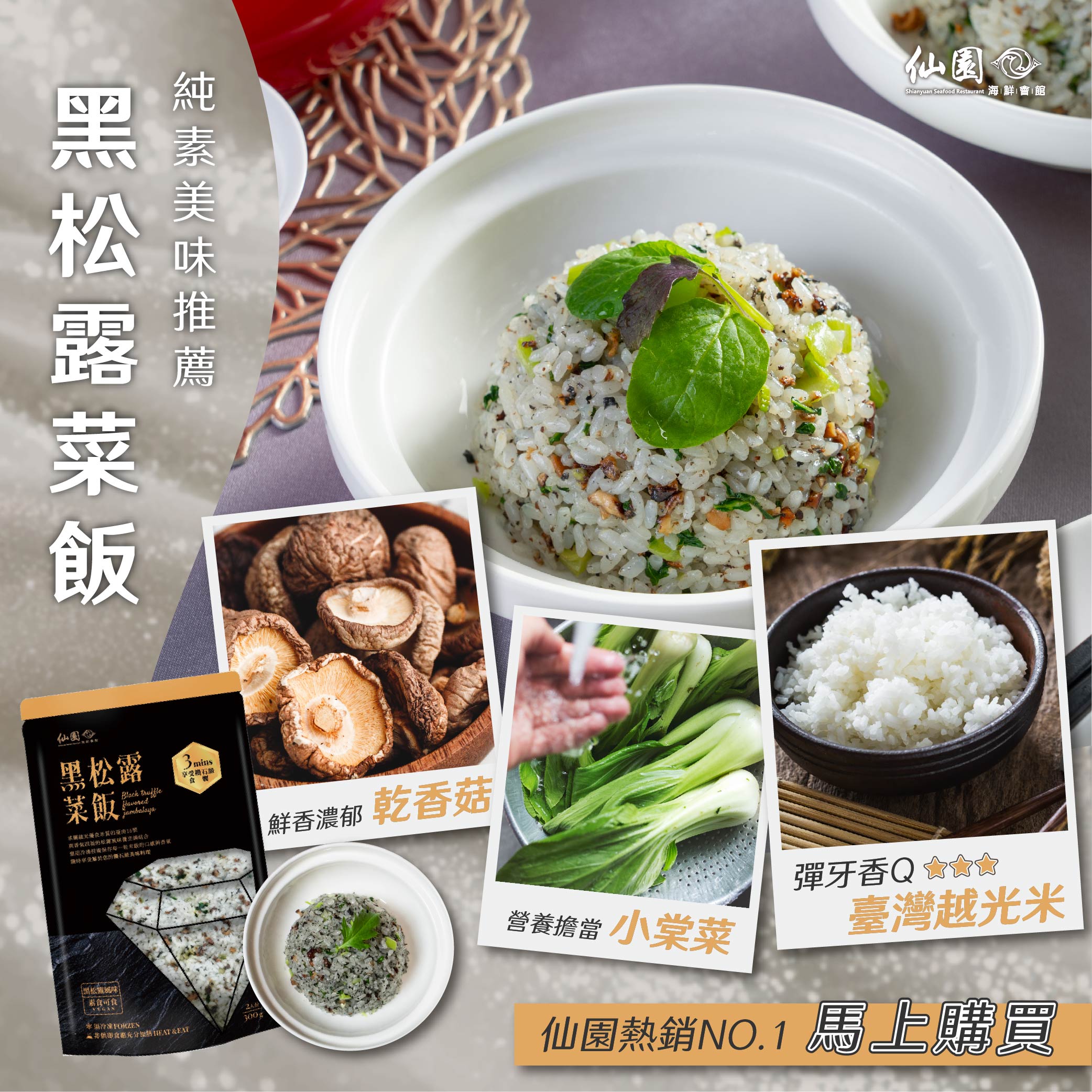商品成份:越光米台南十六號、青江菜、香菇、黑松露風味醬(洋菇片<洋菇.水.鹽.檸檬酸.維生素C>、100%純葵花油、香料、水、黑木耳、烘焙用鹽<海鹽.亞鐵氰化物>、環狀糊經、植物碳色素<葡萄糖漿.水.植物碳.甘油.氫氧化鉀>、黑松露)、素高湯(水、黃豆芽、白蘿蔔、胡蘿蔔、鹽)